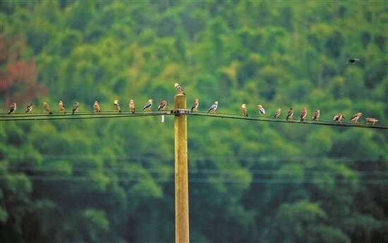 金丝椋鸟排成一排,像一个个音符 谢汉庸 摄