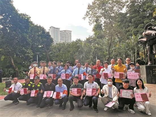 羊城晚报讯 记者张璐瑶摄影报道:11月30日,30位“平民英雄”在广州市首个见义勇为主题园获得表彰。当天上午,广州市见义勇为基金会在广州荔湾湖公园黄河岛举办2023年度第五批见义勇为平民英雄集中慰问奖励活动。