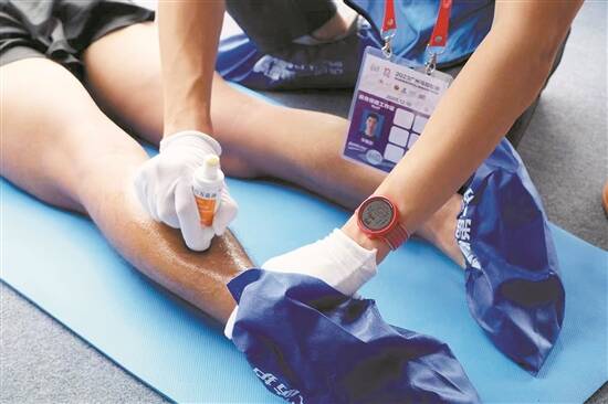 大批完赛的跑友走向终点附近的拉伸区,一股独特的药香在这里弥漫,原来是赛事服务人员正使用跌打万花油为跑友进行按摩放松。