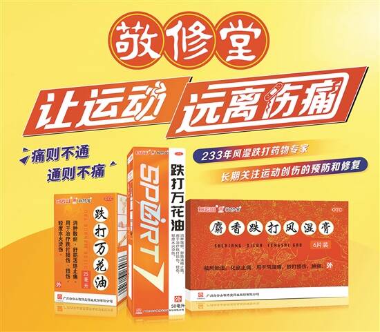 敬修堂跌打万花油和麝香跌打风湿膏这两大产品是敬修堂的经典风湿跌打药物,从消肿散瘀、舒筋通络方面为运动爱好者提供健康守护,帮助跑友“运动前保护,运动中守护,运动后养护”,全方位防范运动损伤。
