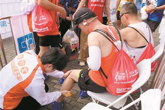 敬修堂专业理疗师为广马参赛者做拉伸服务