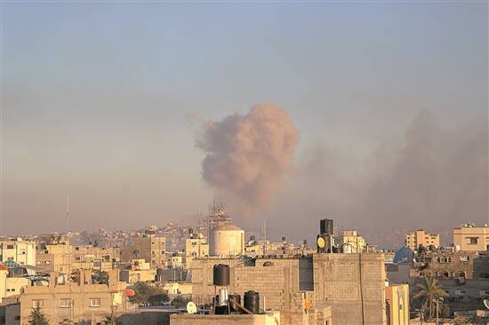 12月15日,在以军空袭过后,加沙南部城市汗尤尼斯城中升起浓烟 新华社 发
