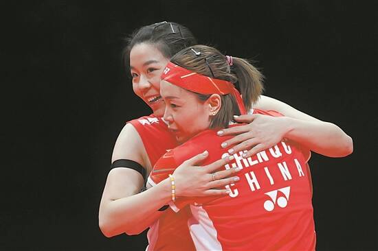 陈清晨(右)/贾一凡在夺冠后拥抱 新华社发
