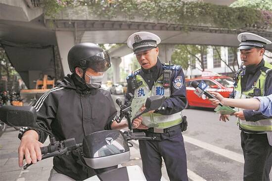 在东风东路梅东路口,执勤交警将一辆违规的“电鸡”车主陆先生拦下,并对其罚款。