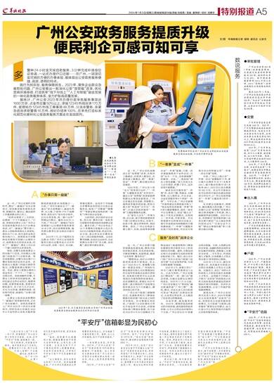 践行为民宗旨,服务保障民生。2023年,聚焦企业群众急难愁盼问题,广州公安推出一批深化公安“放管服”改革、优化营商环境举措,打造筑牢“线下与线上”“人工与智能”融合发展的一体化政务服务体系,全力护航高质量发展。