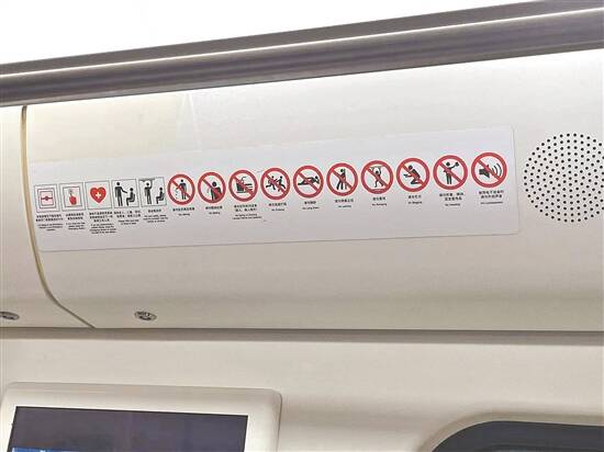 地铁车厢内有禁止电子设备外放声音等标识 羊城晚报记者 严艺文 摄