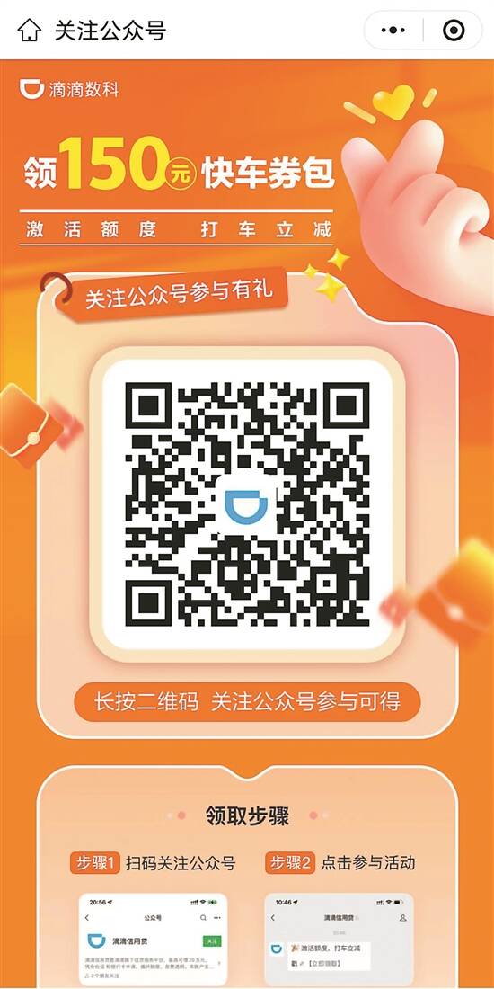 关注后,会提示“恭喜,获得150元快车券包,戳小程序立即领取”,随后进入滴滴旗下信贷服务平台,并提醒勾选协议、领取额度。记者多次退出小程序重新进入页面才提到领15元快车券,需要激活额度;领取剩下的135元快车券包,则需要借款成功。