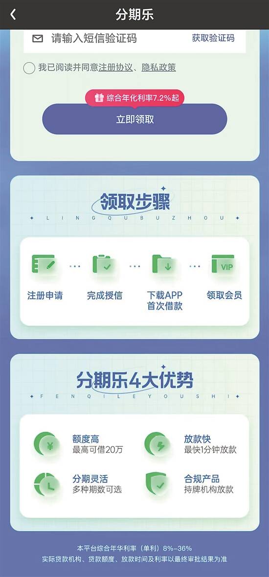 记者还留意到,部分产品详情页最中间写着最低年利率,实际上藏着另一副“面孔”。比如,爱奇艺App引流的拍拍贷强调“年化利率4.8%起”,拉到最底下却是一行很小的浅灰字体“本平台综合年化利率单利4.8%-24%”。分期乐的页面展示同样“煞费苦心”,底下注明的平台综合年化利率单利为8%-36%。