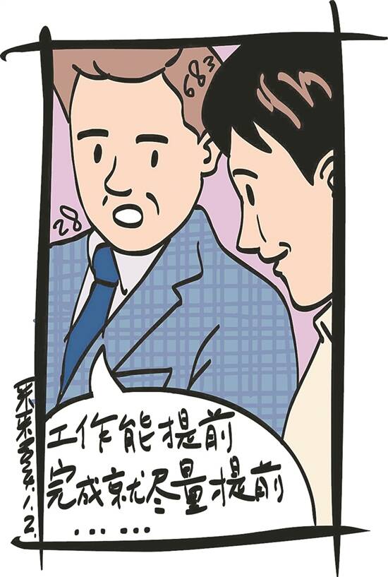 但林主任对小王有一点不满意,就是每次交给小王写的材料,他都是不到最后时限不交差,这让林主任觉得有点不托底。他心里盘算着,一旦有个阴差阳错,等着稿子用的时候“掉链子”那可不是闹着玩的。于是林主任就在平时闲聊时话里话外地点拨小王工作上打点提前量,聪明的小王总是嘴上应和着,可仍然我行我素。真是艺高人胆大,小王每次写的材料从来也没耽误过事,这让林主任悬着的心总是起起伏伏的。但人家毕竟没出纰漏,他又不好过于苛求。
