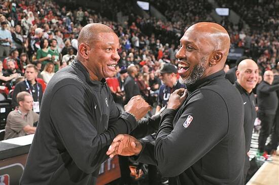 里弗斯(左)和开拓者主帅比卢普斯寒暄 图/视觉中国