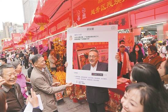 越秀西湖花市上,人大代表开展迎春花市专题调研,代表热情举着“朋友圈打卡板”欢迎外地游客