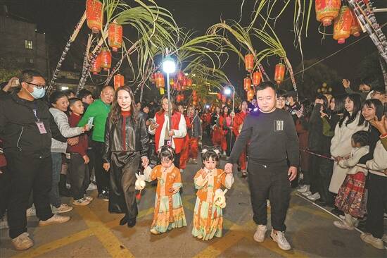 记者在现场看到,参与巡游祈福许愿的当地男丁身着蓝布长衫,腰系红绸,肩披毛巾,头戴金花礼帽,大多数脚上着袜却不穿鞋;姑娘们则精心装扮,或抬标旗,或挑花篮,或演奏民间乐器……撑着“蔗灯”的村民列成两排,将手中的蔗灯高高举起,仿佛演变成甘蔗林里的通道,巡游队伍便从中间的“蔗巷”穿过。