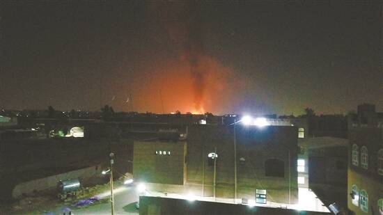 2月24日,也门首都遭到美英战机空袭后升起浓烟(手机拍摄) 新华社发