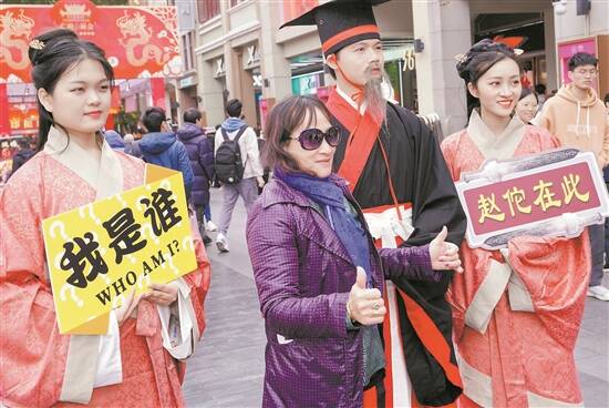 当天上午,北京路千年古道上,真人扮演的南越王“赵佗”惊喜亮相,“冼夫人”“苏轼”“张九龄”等岭南代表性人物也相继登场,与市民游客比拼“飞花令”、诗词接龙互动、开展文采大比拼,现场乐趣十足。在“城市印迹”活动中,不少游客打卡龙藏街、回龙路、泰康路、福地巷、吉祥路等“好意头”道路街巷。