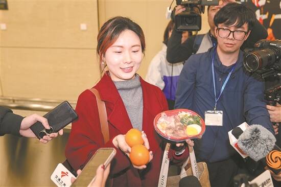 零时在横琴口岸通关的首位澳门居民程小姐向记者展示她带的水果和夜宵 羊城晚报记者 梁喻 刘畅 摄
