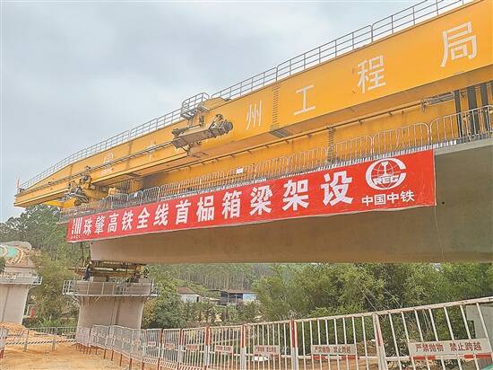 羊城晚报讯 记者陈卓栋,通讯员朱强、唐景华摄影报道:3月27日上午,随着一榀重达821吨的预制双线箱梁精准、平稳地架设在珠肇高铁江门段鹤山桃源珠岗大桥桥墩上,珠肇高铁全线首榀箱梁顺利完成架设,项目正式进入箱梁架设施工阶段。
