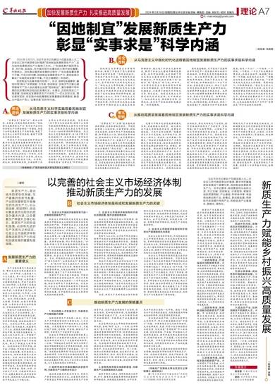 新质生产力发展是对城乡经济发展模式的根本变革,城乡区域因地制宜推进、共享发展是其本质要求。以绿色生产力为主导的乡村生态经济为新质生产力发展提供了一个天然场域,城乡之间、区域之间、乡村不同类型之间的差异,要求其必须因地制宜、分类推进。新质生产力赋能乡村振兴,需要与乡村生态经济有机结合,打造新质生态、扶持新质研发、培育新质产业、发展新质企业、优化新质治理、培养新质人才,实现乡村全面振兴和高质量发展。