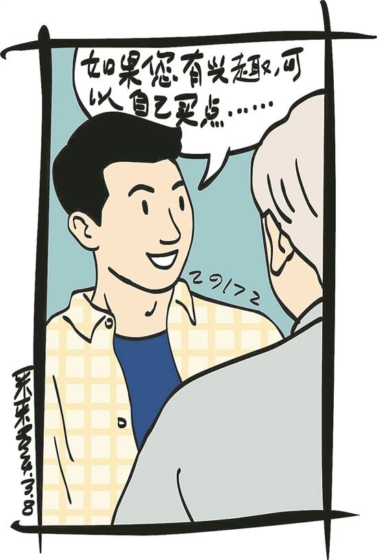 小军又交代:“如果您有兴趣的话,可以自己也买点,但一定要理性购买。”父亲瞅了一眼小军:“我多大岁数了,还用你说这些?”小军不好意思地摸摸头,连连称是。