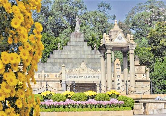 位于广州市越秀区的黄花岗七十二烈士墓园,是中国辛亥革命重要的纪念地。1911年4月27日,孙中山先生领导的同盟会在广州发动武装起义,血战一昼夜,不幸失败,同盟会骨干成员牺牲百余人。这次起义是同盟会组织影响最大的一次起义,也是同盟会牺牲最为惨烈的一次。同盟会会员潘达微冒死收殓烈士遗骸72具,丛葬于红花岗(后改名“黄花岗”,黄花即菊花,象征节烈),史称“黄花岗七十二烈士”。