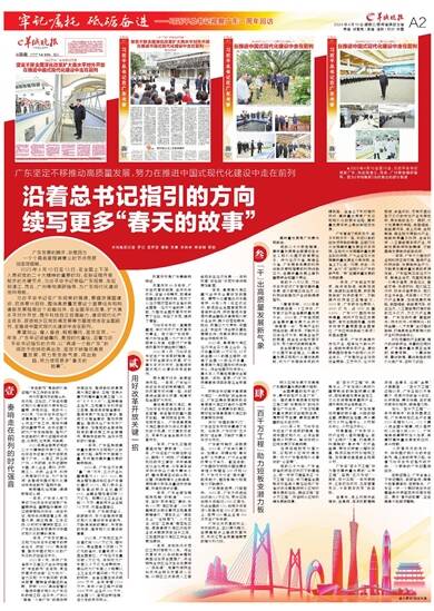 在新征程上,广东全省上下牢记嘱托、砥砺奋进,南粤大地春潮涌动、百舸争流。广东正一步一个脚印把总书记擘画的宏伟蓝图变成美好现实。更多“春天的故事”,正在南粤大地接续唱响。