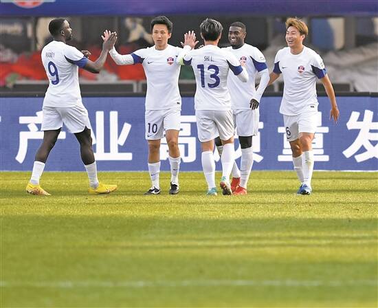 梅州客家队球员在比赛中庆祝入球 新华社发