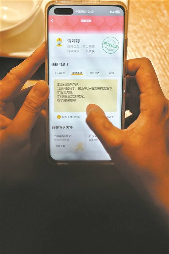 除了记住路线,听障骑手的另一大困难是打电话联系顾客取餐。傅婷婷会提前编辑好文字发给顾客,表明自己是听障骑手;她还上传了残疾证,可以使用平台的无声关怀功能。然而,误解也时常发生——一位顾客看到傅婷婷发来的信息,认定她的听障骑手身份是假的,傅婷婷把自己的残疾证拍下来发给顾客看,“遇到这些误会的时候会比较生气,总想证明我真的是一位听障人士。”