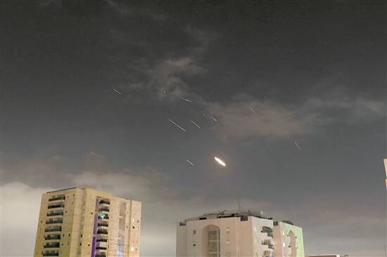 4月14日凌晨在以色列特拉维夫上空拍摄的以色列防空系统启动拦截的画面 新华社发