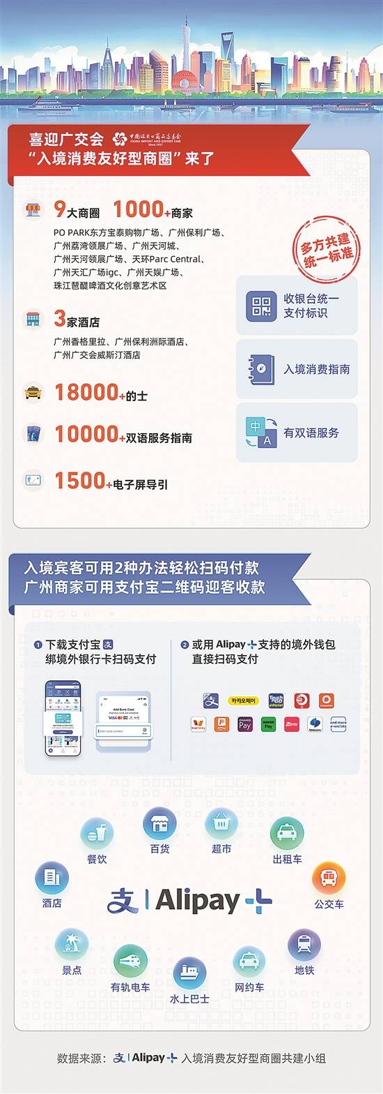 随着广交会的到来,越来越多的外籍人士抵达广州。为了更好地迎接入境宾客,从入境的“落地第一公里”开始,蚂蚁集团就积极参与广交会的支付服务保障工作,通过新设服务台、提供服务指南等一系列办法做好指引。此外,蚂蚁集团还倡导发起了“入境消费友好型商圈共建计划”,广州的9大核心商圈超过1000家商户、3家涉外酒店,以及18000辆出租车和地铁、公交等主要交通出行线路均覆盖其中,让入境宾客在广州实现“手机扫,付得畅,行得通”。