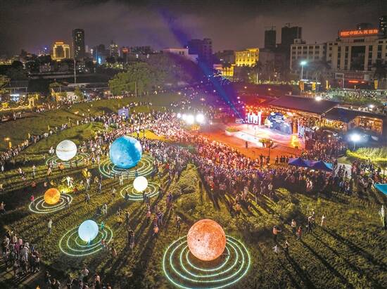 此次音乐会,以“星空”为布景概念,广阔的草坪之上,耀眼的星球组成了一个浪漫的“宇宙”,热爱音乐、向往美好、享受生活的人们因黄皮结缘于此,仰望星空,感受音乐与自然融合的魅力。现场还设置了特色美食夜市,吸引众多游客驻足品鉴、购买。