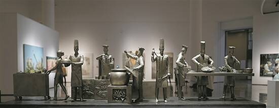 近年来,以粤菜、英歌舞为代表的岭南非遗文化出圈出海。广州雕塑院副院长陆增康以此为题,创作出雕塑作品《粤菜师傅》,获本次省展金奖。雕塑通过排列的构图来展现粤菜厨房制造情景,体现粤菜在各个环节的操作形态,以水箱浮雕来体现食材的鲜活与生猛。陆增康表示,作品把岭南非物质文化遗产的传承,通过粤菜的烹饪艺术与对生态环境的关怀结合在一起,展现了融合传统与现代、美食与环保的和谐共生理念。