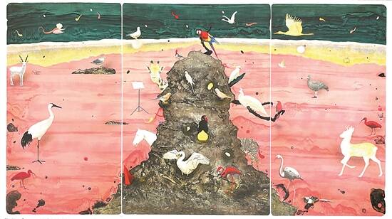 青年艺术家李长兴作品《多彩新篇》获版画金奖,并入选第十四届全国美展版画初评。此前,其作品两次入选全国美展。《多彩新篇》力图营造出多彩的视觉图式和人文景观,谱写物象之间和谐与共生、超然而阳光的生活新篇章。艺术家把当下审美与概念,融入古老版画的媒介中,运用版画语言把各类物象解构与重组,通过将各色动物和主观物象有机组合,链接于超现实的场域中,搭建多彩的生活舞台。