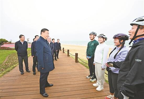 随后,习近平考察了日照市阳光海岸绿道。近年来,日照市对沿海裸露场地及岸线破损处进行生态修复,建成约28公里的阳光海岸绿道,为市民和游客提供了运动休闲好去处。习近平听取绿道整体建设情况介绍,察看修复治理后的海岸线生态环境,了解当地升级文旅产业、提升人民生活品质的做法和成效,并不时同市民和游客亲切交流。他指出,建设绿道应市民所需,是得民心之事。推进中国式现代化,就是要让人民群众的生活越来越好。生态环境好,老百姓就多了一份实实在在的幸福感。大家要一起动手,共同建设和呵护美好家园。