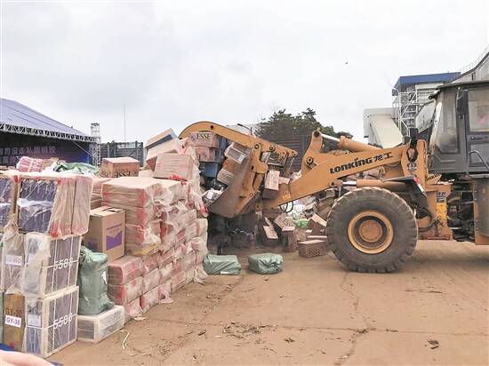 一件件罚没走私卷烟被粉碎后送进焚烧炉