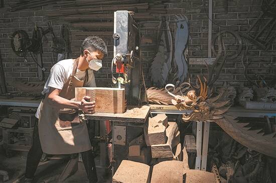 广州黄埔下沙村,张伟潮认真切割着制作龙头用的木头