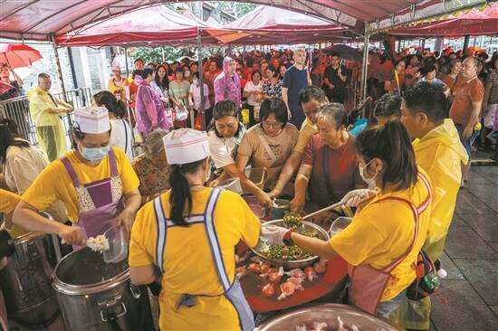广州猎德村的祠堂外,大批村民排队领取龙舟饭