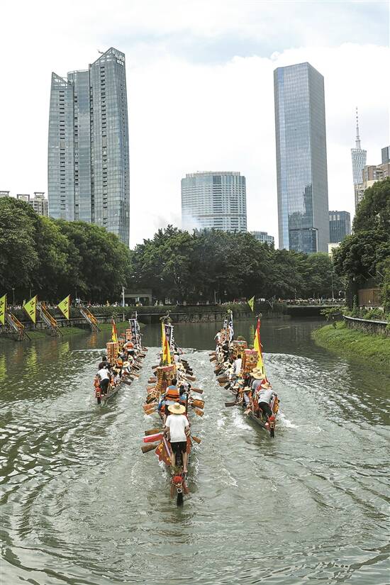 广州冼村龙舟采青仪式,村民在珠江公园旁的水域划龙舟