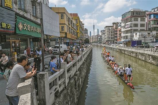 广州大塘村龙舟采青仪式,岸上引来了众多观众