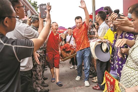 广州车陂村龙舟赛,参赛队伍捧走“大金猪”