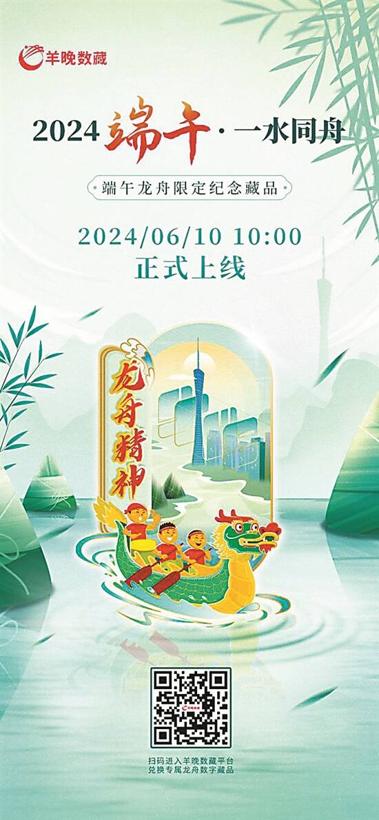 羊城晚报讯 记者聂粤报道:6月10日10时,《2024端午·一水同舟》端午龙舟限定纪念数字藏品在羊晚数藏平台正式上线,用户可使用88积分兑换藏品。