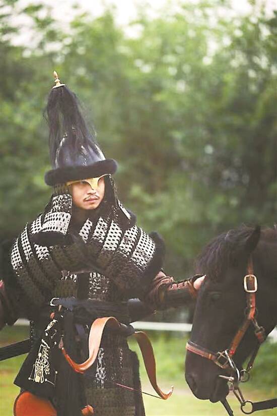 该副甲胄重达30公斤,由5000片甲片层层横排、纵连铆接而成,近看可见上千个内衬孔位,远看则可分辨出头盔、前后身甲、肩吞、捍腰等部件。甲胄下摆绣有游牧民族风格的龙纹,布面装饰也由谭舟洲亲手缝制。