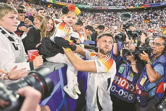 德国队球员尼克拉斯·菲尔克鲁格在比赛后将女儿抱下看台 新华社发