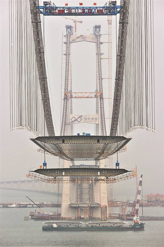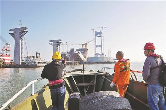 高耸入云的主塔,宛若游龙的桥梁,深海中的隧道,钢筋水泥间,炎炎烈日下挥汗如雨、争分夺秒的身影。