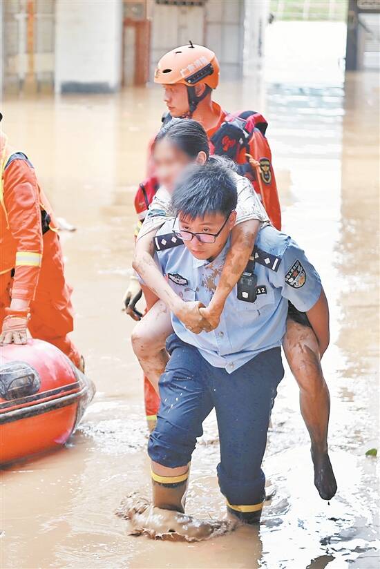 梅州蕉岭县,公安民警转移受困群众 通讯员 何志林 摄