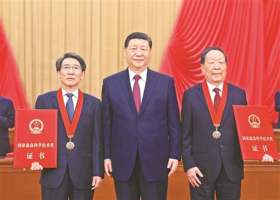 6月24日,全国科技大会、国家科学技术奖励大会和中国科学院第二十一次院士大会、中国工程院第十七次院士大会在北京人民大会堂隆重召开。中共中央总书记、国家主席、中央军委主席习近平向获得2023年度国家最高科学技术奖的武汉大学李德仁院士(右)和清华大学薛其坤院士(左)颁奖 新华社发