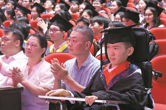 这个仲夏是毕业典礼季,全国有1179万名高校毕业生从这里启航,奔向自己的星辰大海,其中有一位坐在轮椅上的特殊毕业生——广东药科大学云浮校区2024届毕业生蔡泽勋。因罹患罕见病——脊椎性肌肉萎缩症(SMA),他的肌肉萎缩、肌力下降,翻书、写字、敲键盘……这些简单的动作对他来说都非易事。他克服了常人难以想象的困难完成了大学学业,诠释了自强不息、追求卓越的精神,书写了无愧于自己的青春华章。