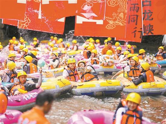 古龙峡国际漂流赛场赛道全程6063米,落差达378米,最快时速72公里,是广东省赛道最长、落差最大、流速最快的漂流项目。新人们在启动仪式当天携手坐上用花朵精心装扮的漂流艇,在惊险刺激的漂流赛道中相互泼水嬉闹,体验难忘的“漂流婚礼”。