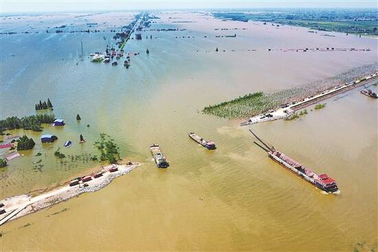 湖南华容县团洲垸洞庭湖大堤决堤之后,现场救援人员正全力封堵决口 曾育文 邓鼎园 摄
