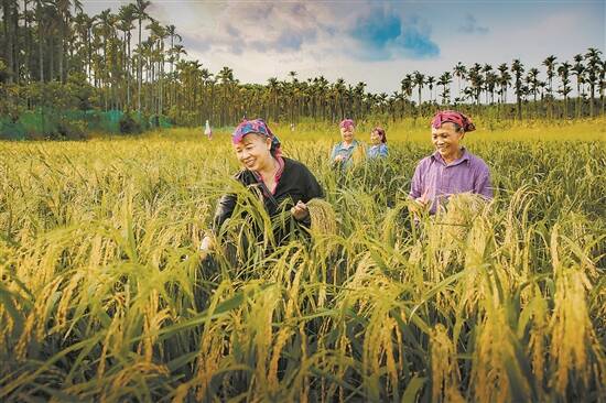 海南省琼海市会山镇加脑村的山兰稻谷成熟了,苗胞农民正在水田里收割。随着农业科技的推广应用,水田种植改变了苗胞毁林烧山、刀耕火种的传统习惯,不但保护了森林,而且提高了山兰稻谷的产量。
