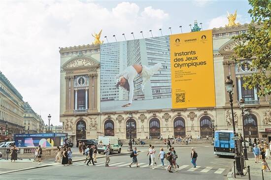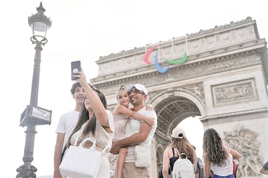 傍晚,挂着残奥会标志的凯旋门的投影长长的,现场打卡的人围得满满的。