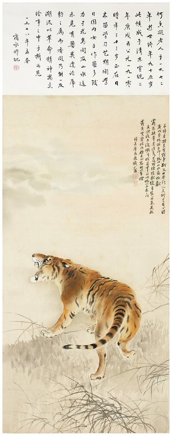 在此期间,何香凝开始以狮虎为绘画的主要题材。虎画是何香凝赠礼画中具有代表性的题材。1910年的《虎啸图》是何香凝现存最早的作品之一,她将其赠与革命先驱黄兴先生。画面中老虎置身于杂乱草丛,呈现匍匐姿态,蓄势待发,威猛之势逼出画外。